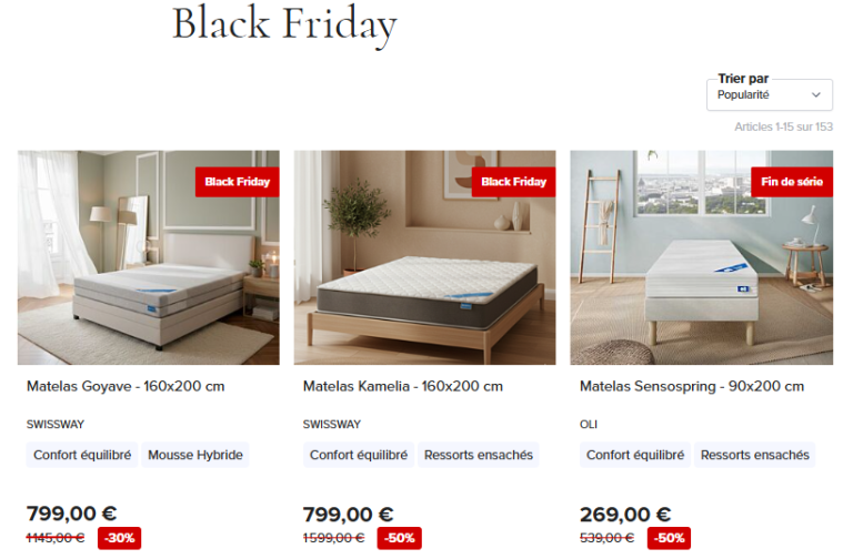 Sur leur page spéciale Black Friday, vous trouverez les meilleures promotions sur matelas et sommiers. Attendez-vous à des réductions sur les grandes marques comme Dorsoline, Dreamway, Art Bedding, Epeda, Bultex, Swissway et Oli.